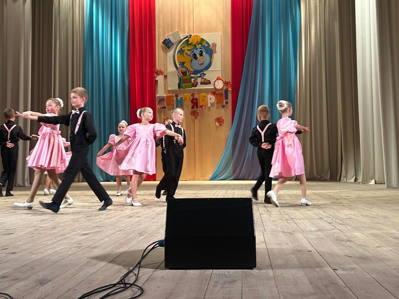 Хвостова Валерия (преподаватель Попова М.А.) и обучающиеся хореографического отделения ( образцовый ансамбль Каприс - руководитель Сковороднева Л.Н.) поздравили учеников и преподавателей района с Днём знаний!